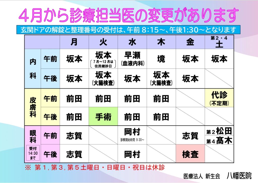 皮膚科の手術日が水曜日午後から火曜日午後に移動します。
